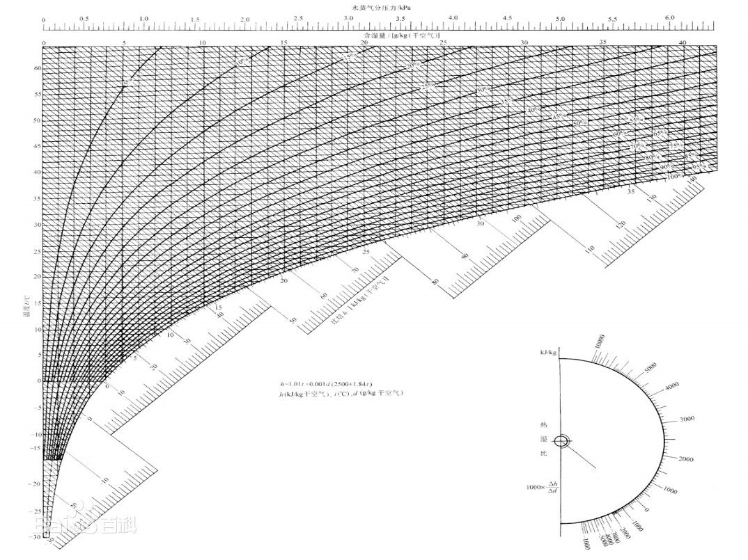 下圖為濕空氣焓濕圖(部分)的示意圖(圖片來源百度百科)。 該圖是以1kg干空氣的濕空氣為基準繪制的。不同大氣壓的焓濕圖是不同的。焓濕圖上有幾種等值參數線:等焓(h)線—與縱坐標成135°角的直線;等含濕量(d)線—平行縱坐標軸的直線;等干球溫度(t)線—近似水平的直線;等相對濕度(Ø)線—圖中的曲線;等濕球溫度線近似與等焓線平行,圖中未表示;水蒸氣分壓力(pw)與d成單值函數關系,其值表示于d的上方,等pw線平行于等d線;圖的右下方給出了熱濕比ε的方向線,熱濕比又稱角系數。