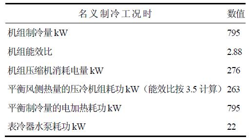 該測(cè)試系統(tǒng)在測(cè)試時(shí),運(yùn)用表冷器能夠使得冷熱量自平衡,最大限度地利用風(fēng)冷冷(熱)水機(jī)組使用側(cè)的冷量與熱源側(cè)的熱量交換,熱源側(cè)的熱量被使用側(cè)的冷量平衡后剩余的只有壓縮機(jī)的功率這部分熱量需要通過(guò)冷卻設(shè)備散去,并不需要消耗大量的能量來(lái)單獨(dú)平衡使用側(cè)產(chǎn)生的冷量和熱源側(cè)產(chǎn)生的熱量。而且風(fēng)冷冷(熱)水機(jī)組的能效比越高,同等制冷量下,需要測(cè)試系統(tǒng)散去的壓縮機(jī)功率也就越少,測(cè)試系統(tǒng)也越節(jié)能。以800kW風(fēng)冷冷(熱)水機(jī)組制冷為例,表冷器的運(yùn)用對(duì)測(cè)試系統(tǒng)的耗能比較見(jiàn)表1。