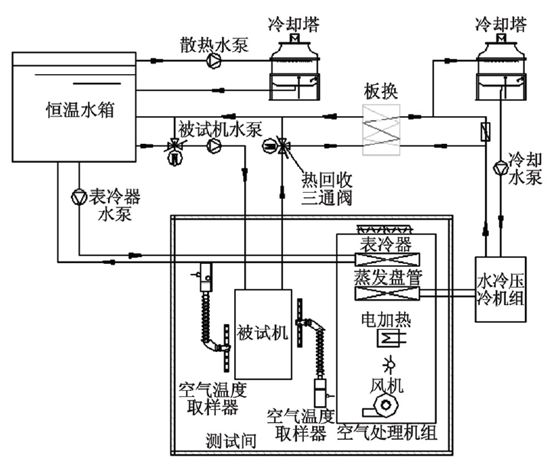 風(fēng)冷冷(熱)水機(jī)組測(cè)試時(shí),通過(guò)空氣處理機(jī)組將風(fēng)冷冷(熱)水機(jī)組風(fēng)側(cè)產(chǎn)生的冷熱量進(jìn)行處理,使得測(cè)試間內(nèi)的溫濕度達(dá)到國(guó)標(biāo)要求的值。而機(jī)組產(chǎn)生的冷熱水回到水箱后,通過(guò)水箱配置的冷熱源進(jìn)行平衡,從而達(dá)到機(jī)組在國(guó)標(biāo)要求的工況下穩(wěn)定運(yùn)行,采集系統(tǒng)將所有的測(cè)點(diǎn)采集,通過(guò)電腦內(nèi)專(zhuān)業(yè)計(jì)算軟件進(jìn)行計(jì)算輸出實(shí)驗(yàn)報(bào)告。
